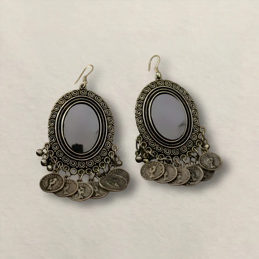 Vintage Oxidized Silver Mirror & Coin Drop Earrings : Bohemian Statement Collection