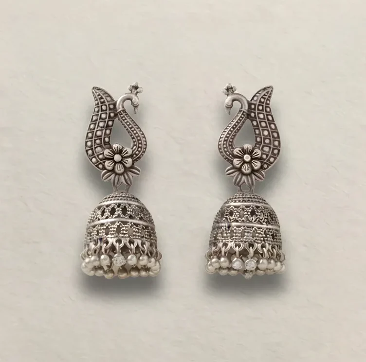 These beautifully crafted jhumka earrings are a perfect blend of elegance and tradition. Designed with a graceful peacock-inspired motif and intricate detailing, they reflect timeless artistry with a modern touch. The delicate pearl drops add a soft, feminine charm, making them an ideal choice for festive occasions, weddings, or even to elevate your everyday ethnic look. Lightweight yet eye-catching, these earrings bring a refined and premium feel to your jewellery collection.